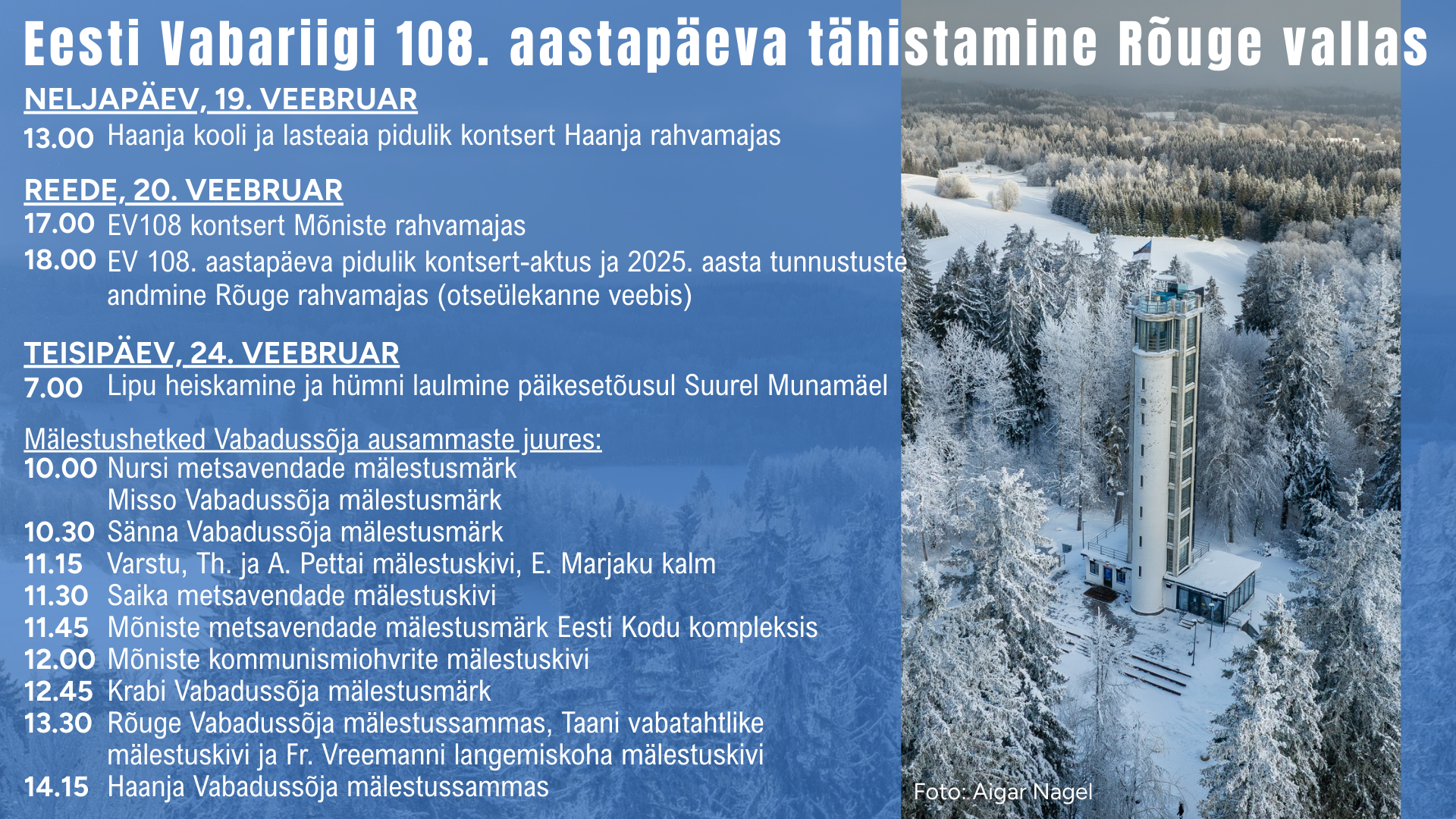 Olete oodatud osa saama Rõuge vallas toimuvatest Eesti Vabariigi 108. aastapäeva sündmustest: