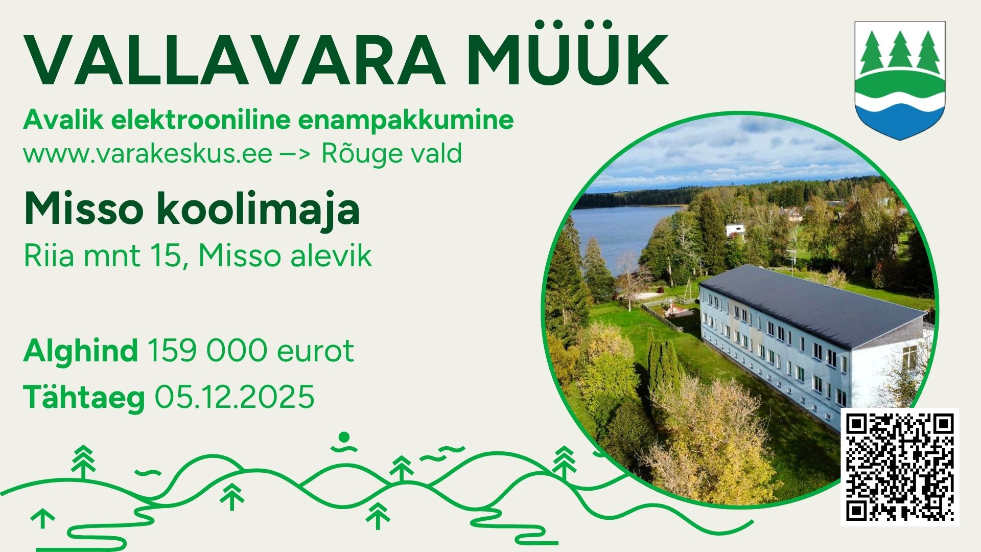 Kuni 5. detsembril 2025 kella 13.00-ni toimub portaalis Varakeskus.ee Rõuge vallavalitsuse avalik elektrooniline enampakkumine, mille raames müüakse endist Misso koolihoonet (Riia mnt 15, Misso alevik; katastritunnus 69801:001:1224) krundi pinnaga 3674 m2. Oksjoni alghind on 159 000 eurot.