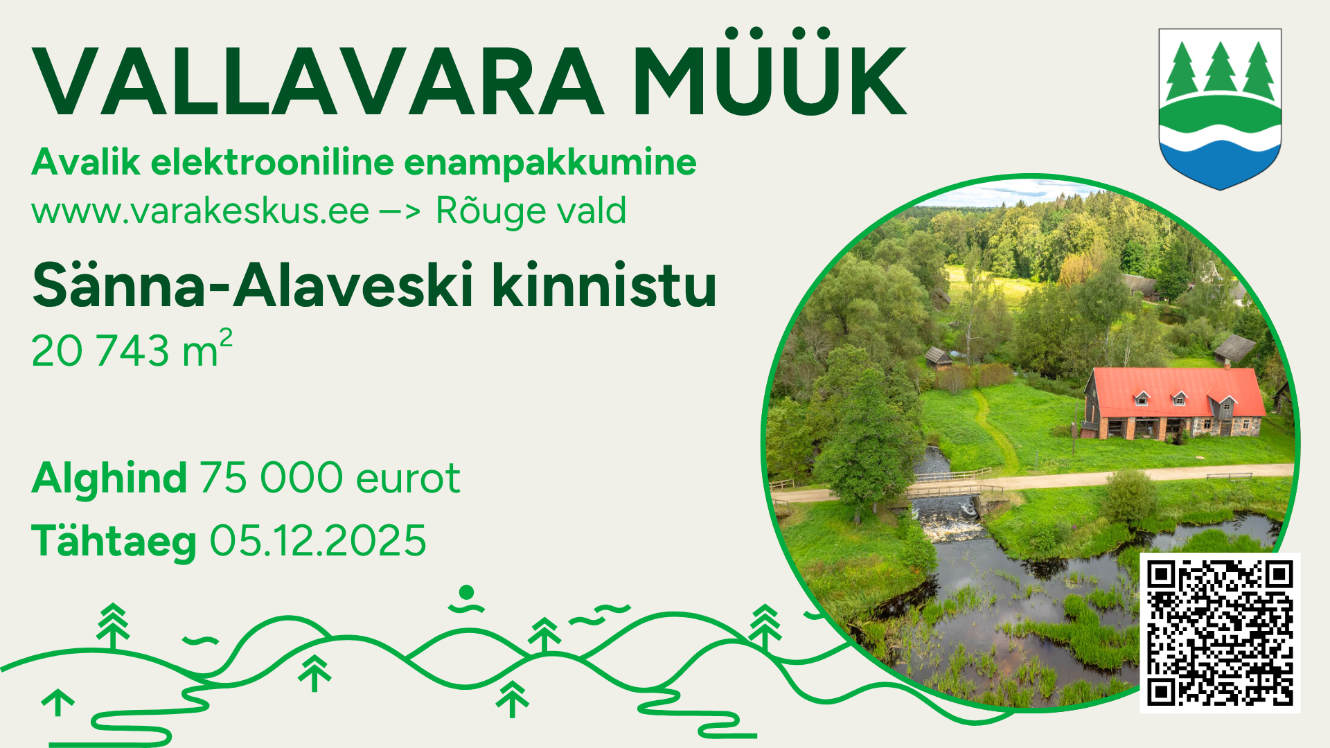 Kuni 5. detsembril 2025 kella 13.00-ni toimub portaalis Varakeskus.ee Rõuge vallavalitsuse avalik elektrooniline enampakkumine, mille raames müüakse looduskaunis kohas paiknevat Sänna-Alaveski kinnistut (katastritunnus 69701:003:0184) pindalaga 20743 m2. Oksjoni alghind on 75 000 eurot.