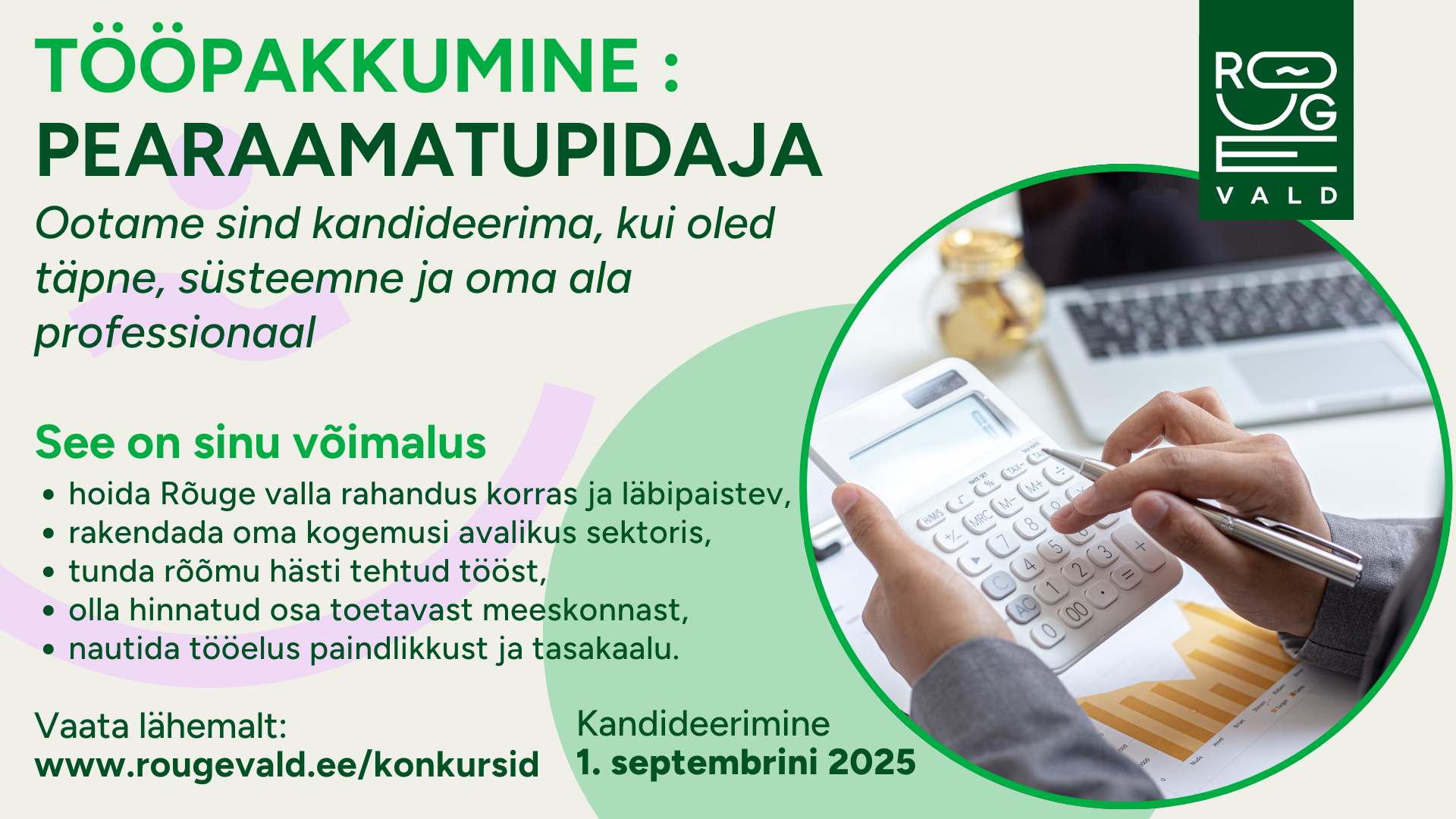 Usaldame sinu hoolde kogu valla raamatupidamise alates tehingutest kuni aruannete ja finantsanalüüsideni. Sa hoiad korras pearaamatu, koostad majandusaasta aruandeid ja osaled eelarvete koostamises. Hoolitsed selle eest, et kõik maksed ja deklaratsioonid liiguksid õigesti ja õigeaegselt.