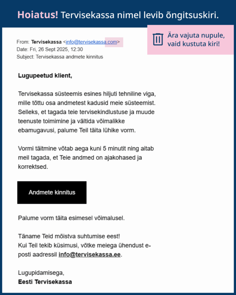 Kui peaksite sellise pöördumise saama, siis tegemist on pettusega. Palume kirjas kõiki juhiseid eirata ning kiri kustutada. Petukirja tunneb ära eeskätt selle järgi, et see tuleb meiliaadressilt, mida Tervisekassa ei kasuta. Konkreetse õngitsuskirja puhul on kasutatud vigast meiliaadressi lõppu @com.