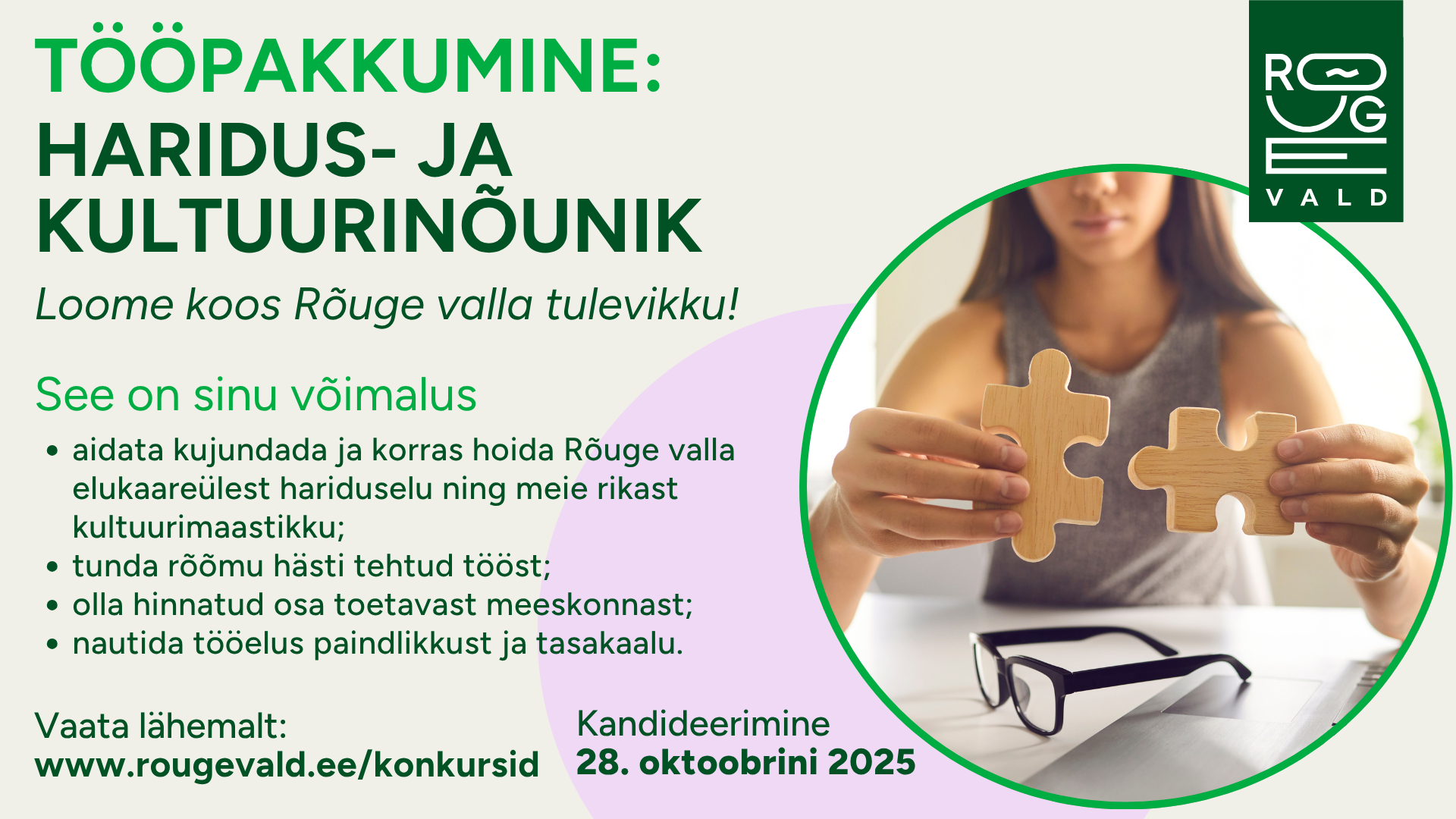 Kandideerimiseks palume esitada CV ja motivatsioonikiri märgusõnaga “Haridus- ja kultuurinõunik” hiljemalt 28. oktoobriks 2025 Rõuge Vallavalitsusele e-postile