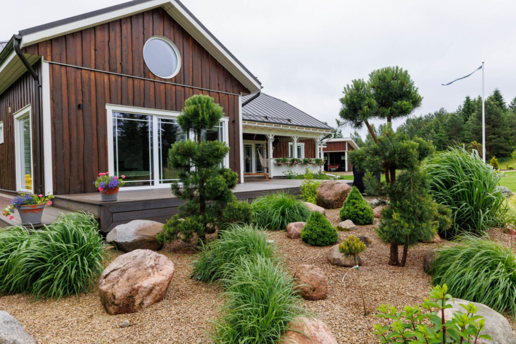 Terviklikult kujundatud koduaed, mis ühendab ilu ja funktsionaalsuse.